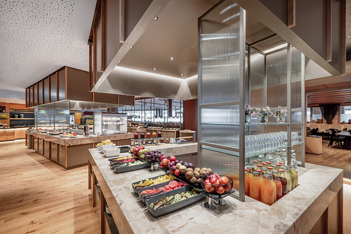 Ogni giorno gli ospiti hanno a disposizione un menù gourmet che cambia quotidianamente, per poter scegliere tra le specialità delle tradizioni austriache e i grandi classici della cucina internazionale. Chi preferisce servirsi da solo, trova al buffet un’ampia selezione di qualsiasi cibo. Verdure, sottaceti, affettati, formaggi e dolci, nonché i piatti caldi preparati durante il cooking show. La cantina vanta più di 300 etichette, tra cui un’interessante selezione di vini austriaci per gli appassionati. Per i viaggiatori di lavoro e le aziende è inoltre disponibile un’area riunioni di 900 m² per eventi in grado di accogliere fino a 800 persone, perfetta anche per presentazioni di auto. Dopo cena si può concludere la serata con stile nel raffinato bar a specchi con musica dal vivo, ispirati dal competente team del bar, prima di ritirarsi nelle camere dal profumo di legno per un sonno ristoratore.