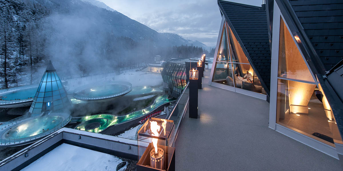 Guardando in alto verso le imponenti montagne attraverso le finestre appuntite che ricalcano la forma delle vette, si percepisce una fusione tra architettura e natura, interno ed esterno. Il tutto è completato dagli esclusivi trattamenti di bellezza “thermal deep” nella SPA. Da non perdere le meravigliose sessioni nell’area saune, gli attrezzi esclusivi di Cybex e l’ampia offerta di corsi nel centro fitness. Ma soprattutto il “bagno al chiaro di luna”, che l’AQUA DOME propone ogni venerdì fino a mezza notte. Ci saranno fiaccole che brillano ovunque e un suggestivo cielo stellato che regala momenti indimenticabili per bagni notturni dall’imbattibile atmosfera romantica.